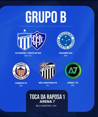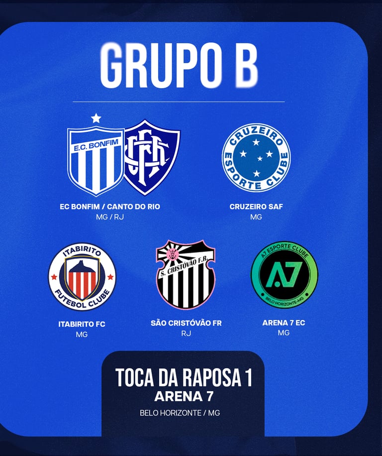 O Grupo B da competição será composto por Cruzeiro (MG), Itabirito (MG), Arena 7 EC (MG), São Cristóvão (RJ) e pela parceria Bonfim/Canto do Rio (RJ). Os jogos da primeira fase serão realizados em Belo Horizonte, com sedes na Toca da Raposa I e na Arena 7. A estreia do Azulão está marcada para o dia 7 de outubro, diante do Arena 7 EC, na casa do adversário. Na sequência, o time enfrenta o Itabirito (08/10), o Cruzeiro (10/10) e encerra a primeira fase contra o São Cristóvão (11/10).